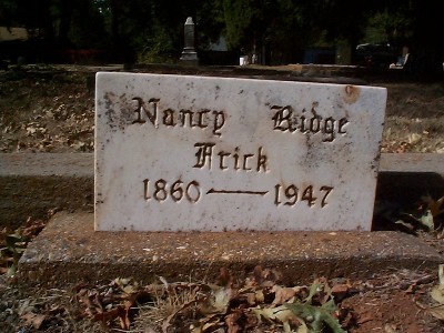 Thomas Moore Ridge (12/18/1893 - 3/5/1894)Nancy Northrup Ridge (10/7/1859 Austin, TX - 1947)[gravestone says born 1860, 1860 Census has her 9 months old] married Jesse Evans Frick (3/1862 CA -9/15/1918 Shasta Co, CA) in 1885 in the Cherokee Nation (Nancy buried in Greenwood Cemetery) - Nancy, at 48, widowed, and living in Shasta County