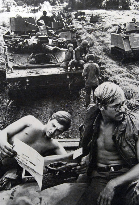 Car company reps follow soldiers on the battlefield to sell cars. In Vietnam,